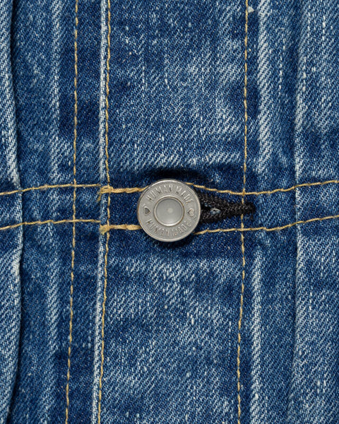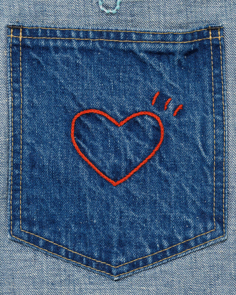 Human Made denim work jacket made from selvage cotton fabric. Features a small chest pocket, embroidery detailing, cinch-back and original HM buttons.
