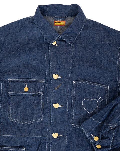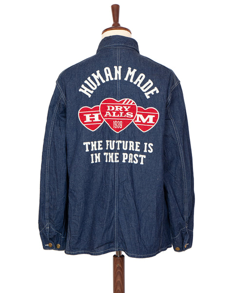 Human Made coverall jacket made from unwashed cotton fabric. Features a paper heart detail on the chest and metal heart buttons.