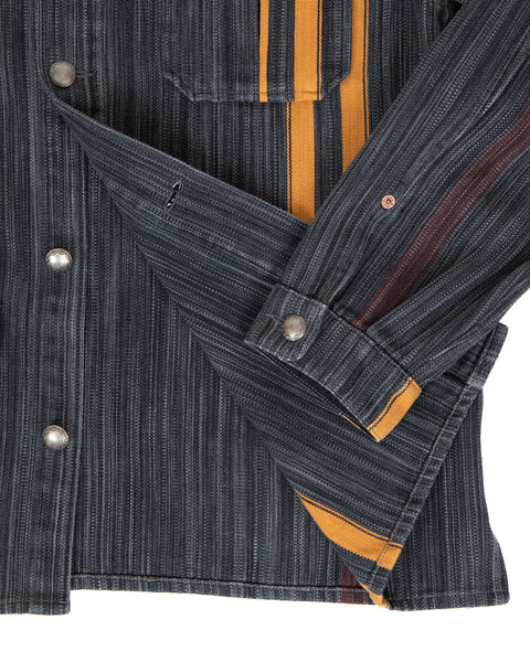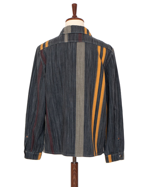 Chore coat cut from a stripe pattern cotton fabric. Woven in Japan on narrow shuttle looms. Additional details include metal concho buttons and two patch pockets on front.