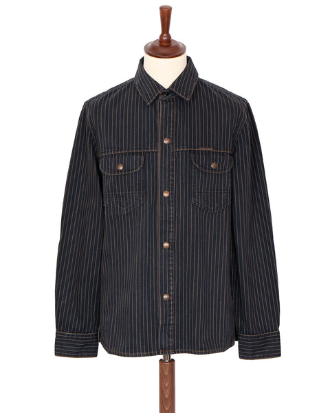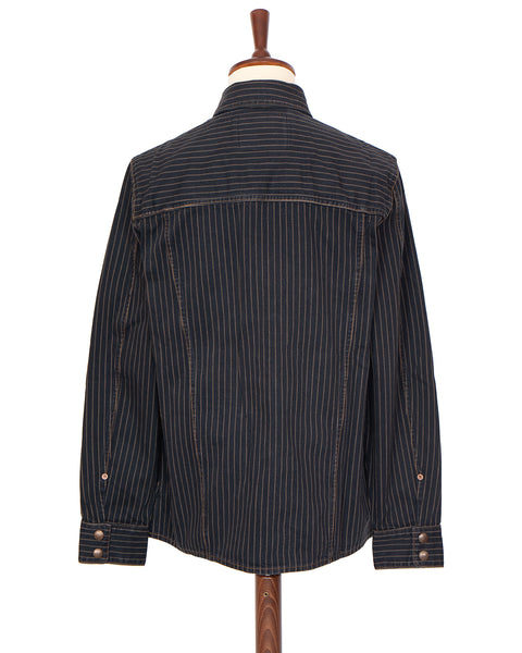 Overshirt in striped wabash denim fabric. Details include branded brass snap buttons, lined collar / cuffs / pocket flaps and Indigofera arcuates on double chest pockets.