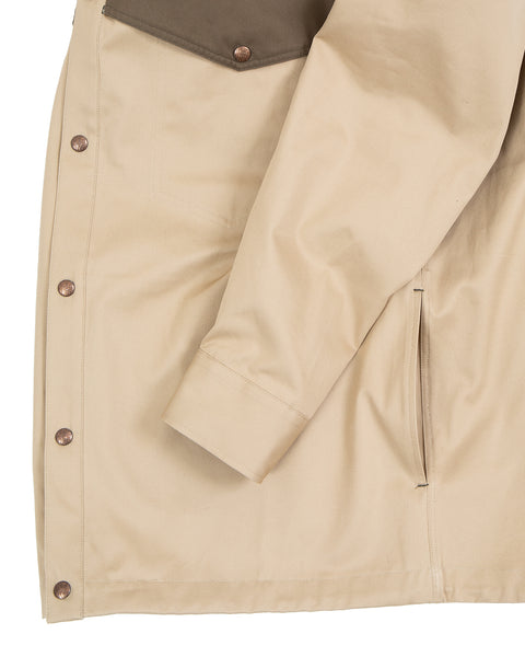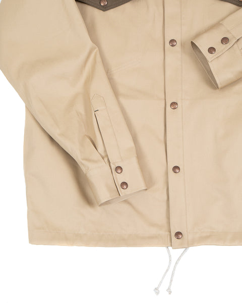 West TX is a new style shirt-jacket made from cotton ventile fabric. Features snap buttons, waist drawstring, double side pockets and two on the chest.