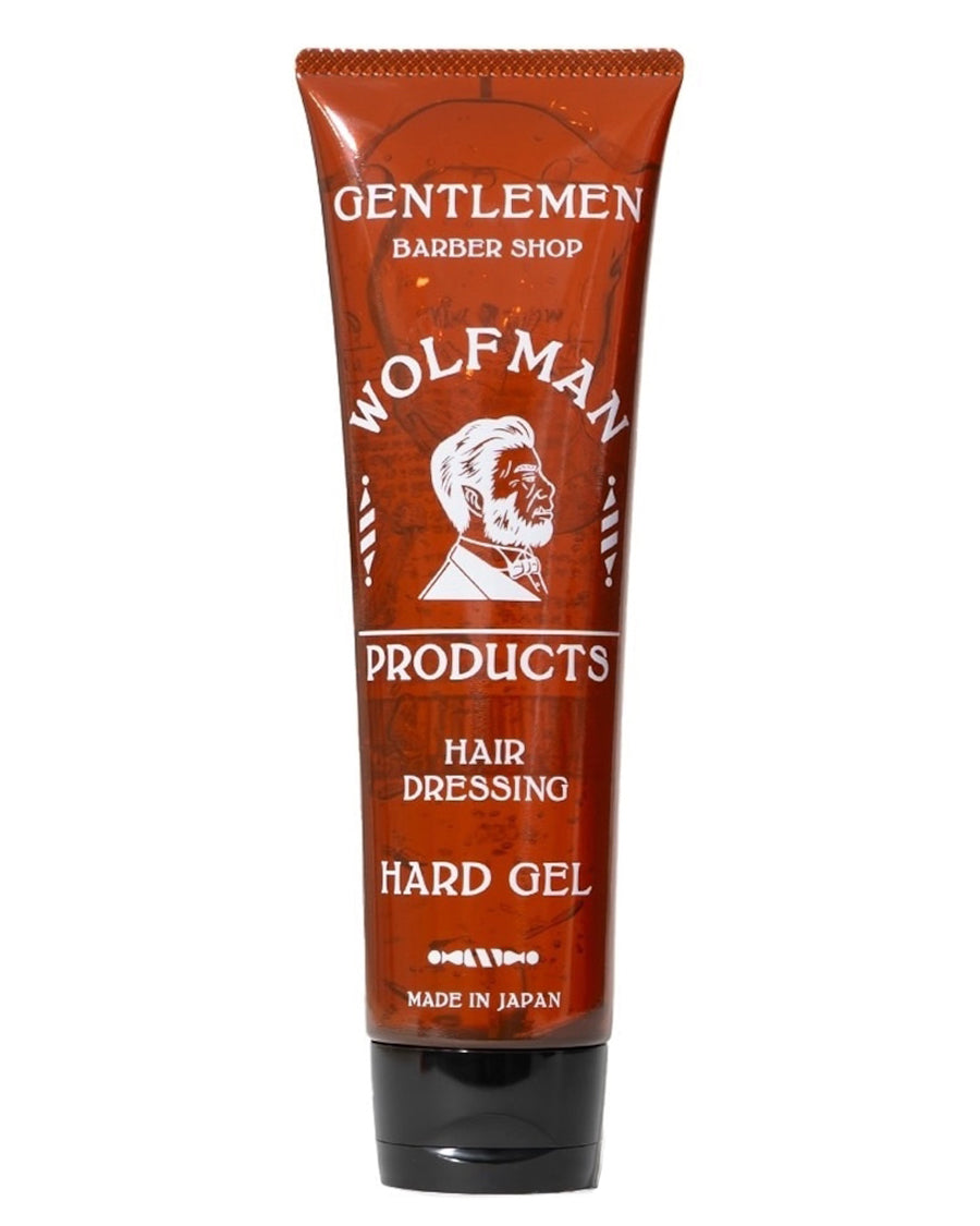Wolfman barber hard gel. This product holds hair in place well and sets firmly even when air-dried. It has the same faint woody and fresh scent as the Wolfman original shampoo.