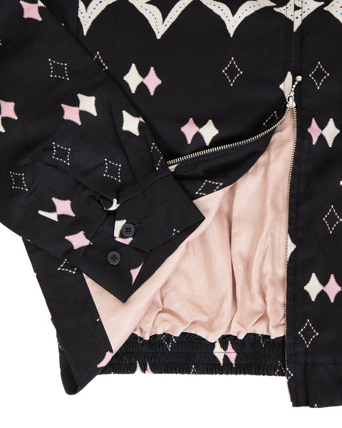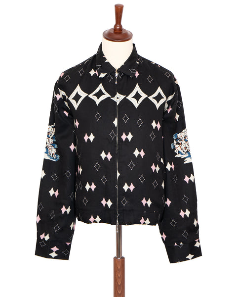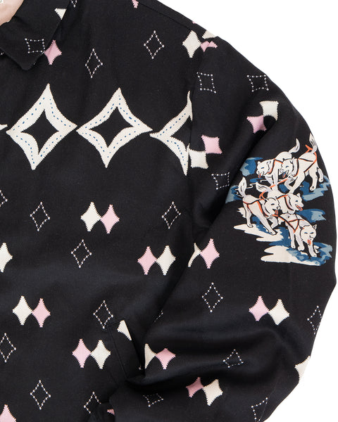 Rayon twill jacket with ainu inspired allover pattern. Zipper closure. Sled dogs print on both sleeves. Double waist pockets.