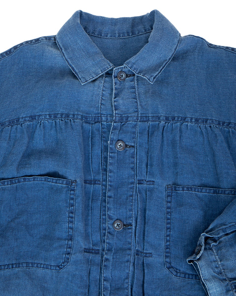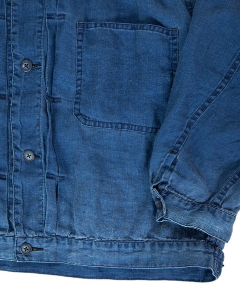 Type 2 style jacket with two chest pockets. Dropped shoulders / loose silhouette. Indigo dyed linen fabric.