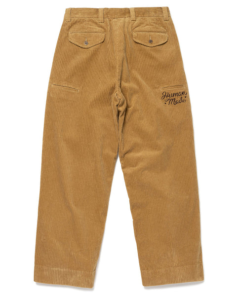 Wide leg pants made from 3D cotton corduroy fabric. Zip fly, embroidery detailing, double back pockets, small side pocket, pleated front.