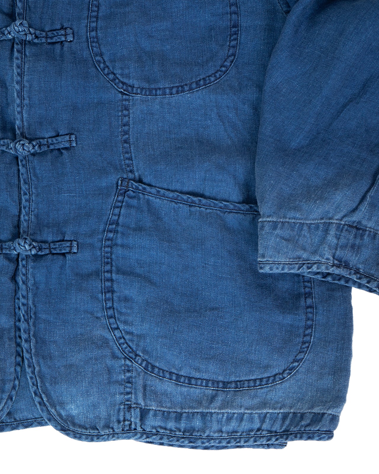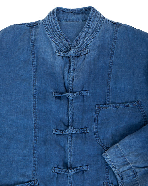 Chinese style jacket made from an indigo dyed linen fabric. Features "knot" button closure, two large front pockets and one smaller on the chest.