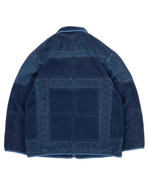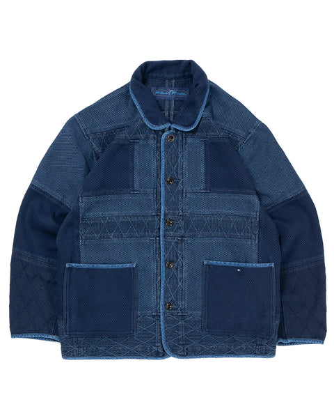 Work jacket made from indigo sea island cotton kendo fabric. Features a buttoned front and two waist pocket.