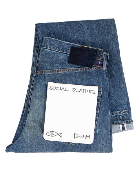 Visvim's Social Sculpture 01 wide jeans, crafted using a premium selvage denim, woven in Japan on vintage shuttle looms. Details include original Visvim hardware, natural dyed buckskin leather patch, selvage waistband / leg. Wide / relaxed fit.