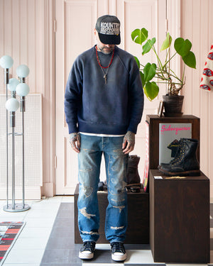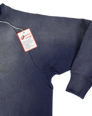 Associated Knitted Outerwear Mills INC was established in the state of New York back in the 1940s, lasting only for 20 years. At the time, AKOM added design to sportswear such as sweatshirts and parkas, which were innovative in design and emphasized functionality. This sweater takes inspiration from the 50s with a round knitted body and freedom sleeves. Distressed finish.