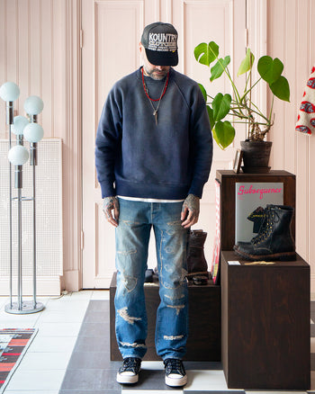 Worn Together With: Kapital cisco jeans and trucker cap. Porter Classic cap. Larry Smith necklaces.