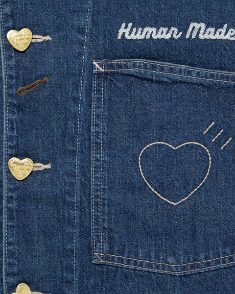 Human Made denim coverall jacket made from selvage cotton fabric. Features multiple pockets, embroidery detailing, and original HM heart buttons.