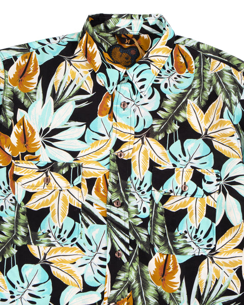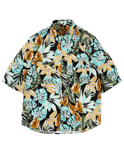 Half sleeve button up shirt cut from a printed rayon fabric. Double chest pockets, sew-on buttons.