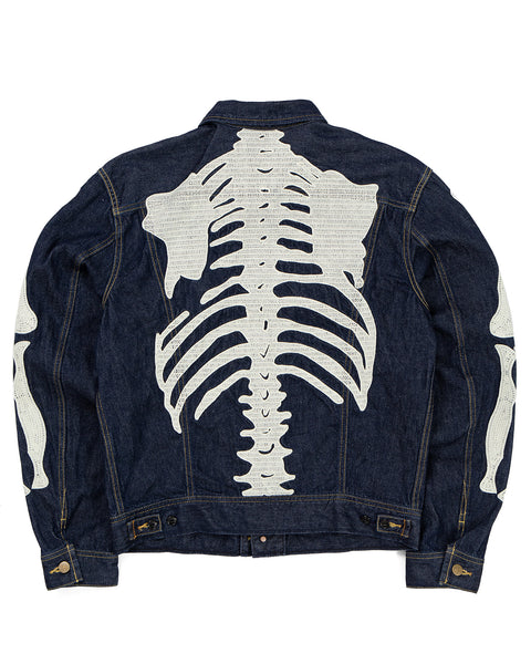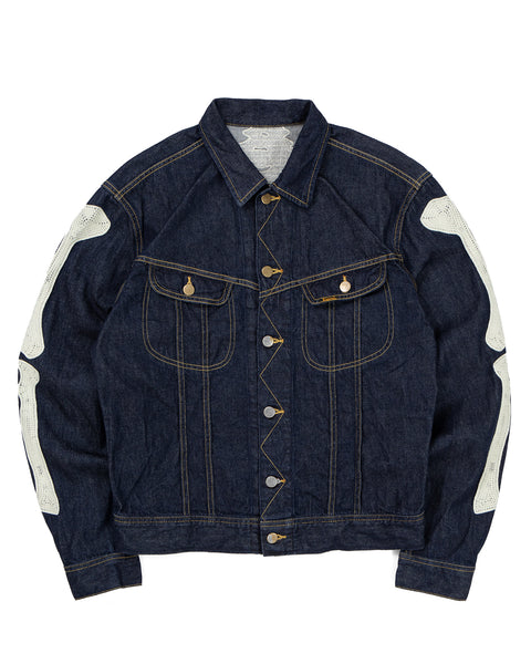 Denim jacket with bone embroidery detailing. Double chest pockets, bakelite waist adjuster buttons and original Kapital brass buttons.
