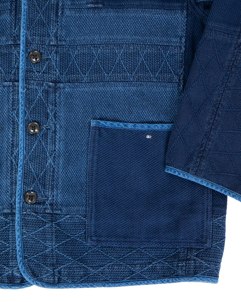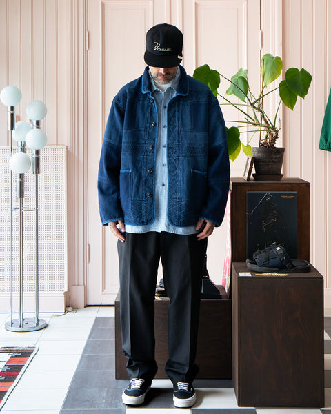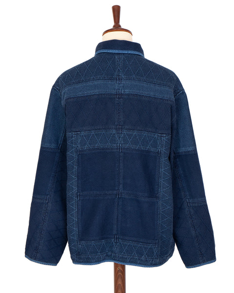 Work jacket made from indigo sea island cotton kendo fabric. Features a buttoned front and two waist pocket.